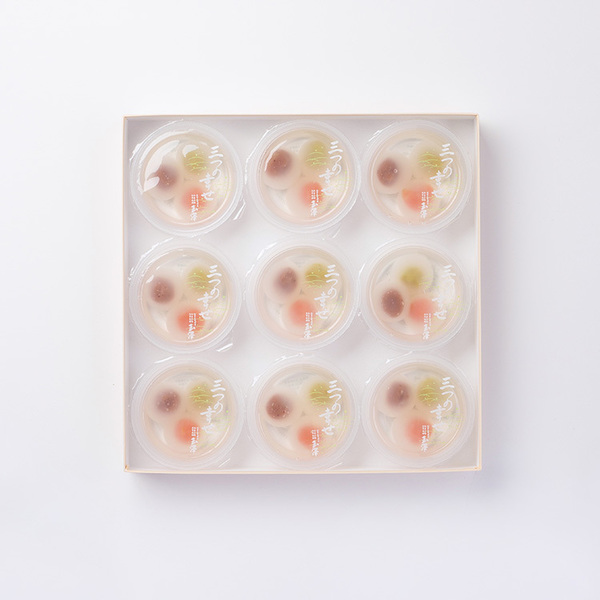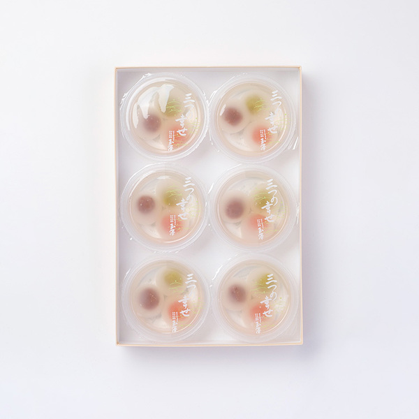 涼しげな透明感のあるゼリーの中に、彩り鮮やかな「りんご、桃、いちご」の三種の水まんじゅうを添えました。 美しい彩りの三種の風味が、お口の中に「ぷるん」と幸せを広げます。 三度笑顔が訪れる、幸せをいっぱいに詰めた御菓子です。